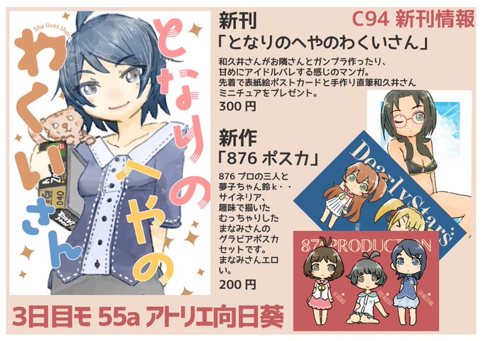 夏コミのおしながきです!新刊は和久井さんのまったり本と、876ポストカードです。和久井さん本には先着でポストカードと、直筆ミニチュアをオマケでつけます。既刊も残り少ない物がありますので、気になった方は是非遊びに来ていただけたらです! #C94