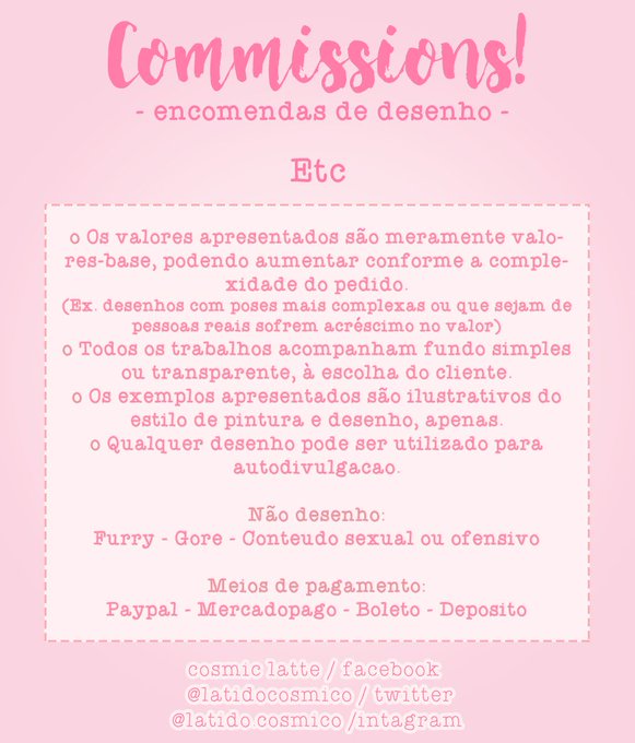 🌟COMMISSIONS ABERTAS!🌟 Tem dúvidas? Quer mais opções? Só chamar na DM! 💖RTs são MUITO bem-vindos pra ajudar na divulgação. 💖
