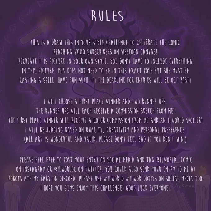 Hi all! In celebration of Ilworld reaching 2k subs on Webtoon canvas, I'm hosting a #DTIYS contest! Please see the third slide for rules! There will be prizes! Deadline Oct 31. Also I'm pretty happy with how this picture of Isis turned out. 😁