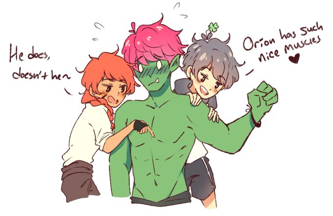Doodled myself interacting with @_namakoo OCs, Orion (blushing green boi♡) and Storyteller (the beautiful red head♡)~ Orion is the type who brings out my sadistic side, so Storyteller and I would totally tag team on making him feel flustered XD ♡♡♡