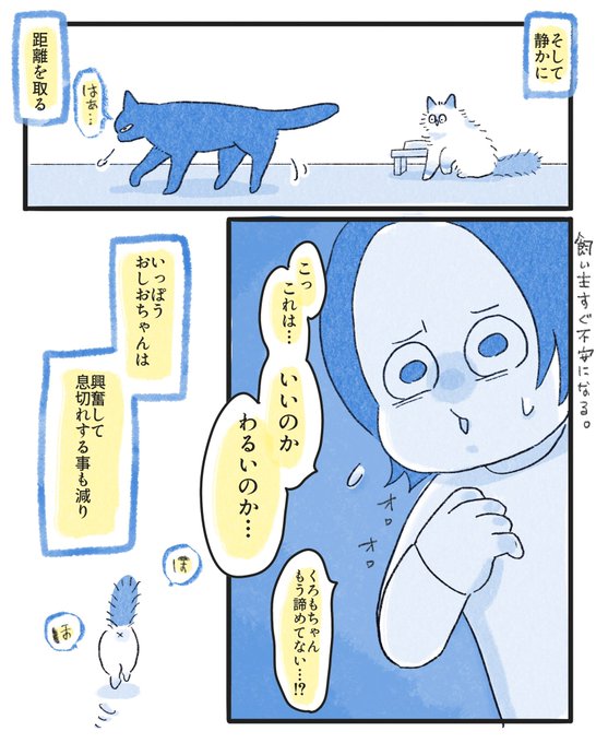 うまくいかない先住猫と新入り猫。 間を取り持ってくれたのは… くろもちゃんの憂鬱16(1/3) #漫画が読めるハッシュタグ