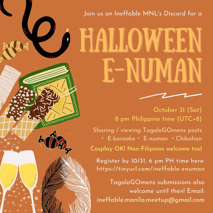 Belated happy birthday to Earth & happy Halloween in advance! Join us on 10/31 (Sat) at 8pm PH time for a virtual Halloween e-numan on our Discord! Register here for the invite & if you like, email us to submit a #tagaloGOmens post (video, meme, etc.): https://t.co/bnROI94BWn