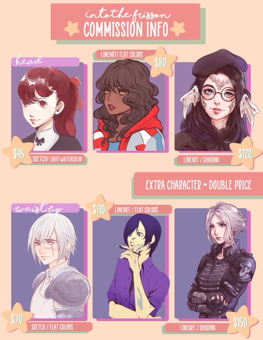 Hi! Just a heads up, I will be updating my TOS and changing my pricing when I do re-open my c0mmissi0ns! If you have already received a quote from me, or have reached out asking about my c0mmissi0ns before this announcement, don't worry! Those changes won't apply to you🙏