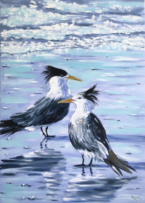 Crested terns at beach original oil painting on canvas by Irina Redine, swift tern original handmade art seagulls wall art original oil on canvas gift idea from my #etsy shop: https://t.co/oyaDCciMYy #art #painting #tern #seagulls #Australia #birds