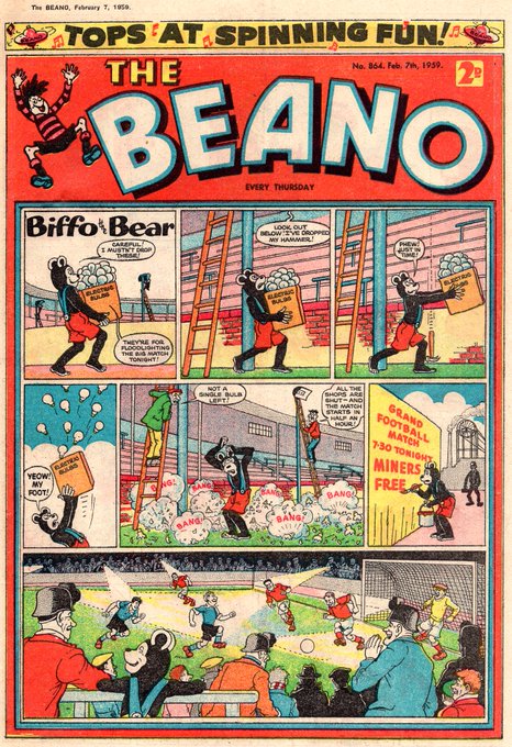 Miners’ headlamps save the match on the front cover of The Beano, in shops at around this time of the year in 1959: