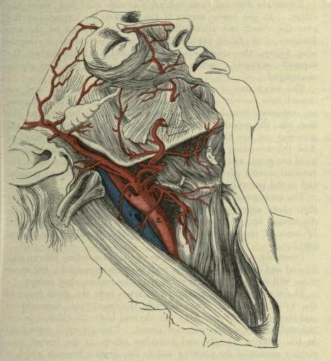 Exposure of common, internal & external carotid arteries & external jugular vein. 'Surgical Anatomy' Maclise, 1859