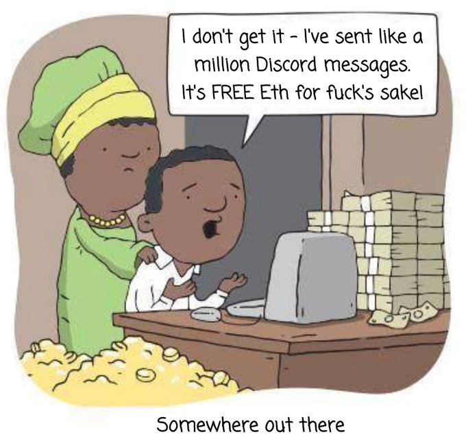 Right now in every #DeFi #Discord #Server there is a sad rich man trying to give away his $ETH and we are #supressing him and #banning him for being a scammer.