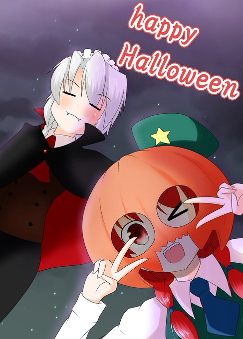 ハロウィン美鈴&咲夜描けた!!(めーさく?) 美鈴お前、やっぱりかぼちゃかぶっただけじゃないか!! 背景かえて二つ!!