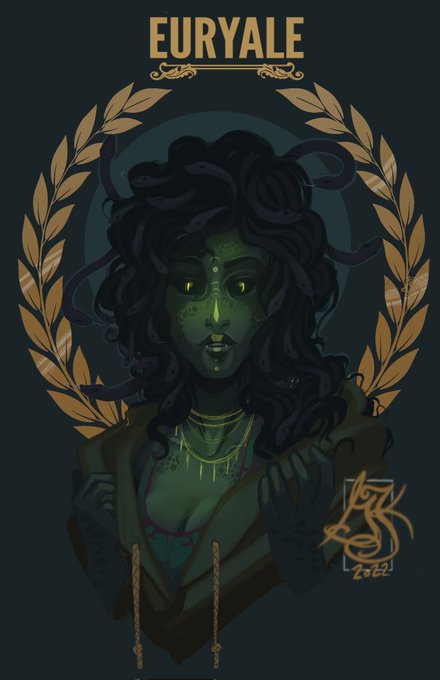 Medusa's name as one of the three sisters. In my story, generations later, her bloodline prevailed but became diluted. #medusa #snakes #itsdeadlyart #ArtistOnTwitter #GreekMythology #greek #comic #characterdesign #procreate #painting #illustration