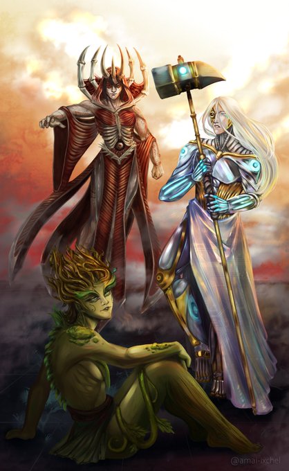 Quería dibujar a los líderes de los Sárkicos y los Mekhanitas, además hice un personaje del Culto del Gran Dios Verde, no tiene nombre, lo dejo a la imaginación.