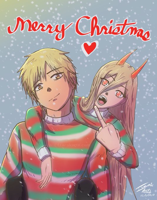 Happy holidays! From Power and Denji! ❤️💚 For those of you who might not know these characters are from Chainsaw Man which is an amazing manga that ended a couple weeks ago and is getting an anime. Hope you all have a good holidays!
