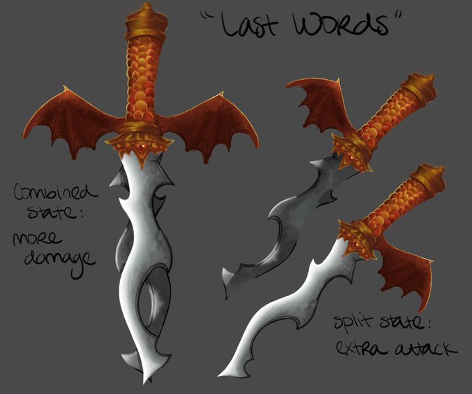 Rough concept of a magic item for my game, a dagger that can transfer from a combined state into two split versions for quicker attacks, with a red dragon flair.