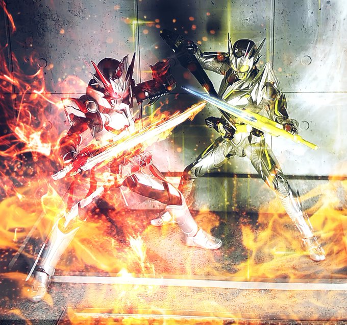 #ライジェネフォト展示会 テーマ『フリー』 仮面ライダーゼロワン メタルクラスタホッパー 仮面ライダーセイバー ドラゴニックナイト −白銀の戦士−