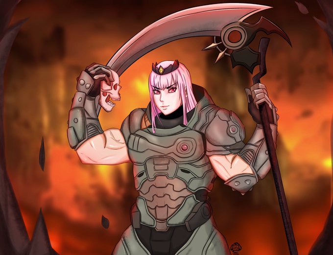 Everytime Calli gets better at Doom, she gets buffer and buffer from slaughtering Demons. Fanart I made for @moricalliope and her DOOM streams.