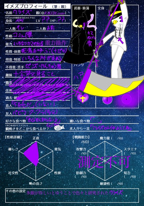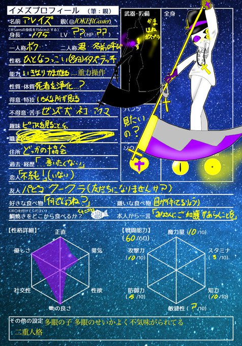 #オリズイメズ絡ませたい企画 #イメズプロフィール キャラシ(?)お借りしました。 areizu(アレイズ)(別人格)とuraizu(ウライズ)(元)です ウライズから出来たのが アレイズ ほとんどいる人格がアレイズ ウライズは稀に出てくる、 家にいる時は服みたいなパーカー着て 外出る時は羽織るパーカー。