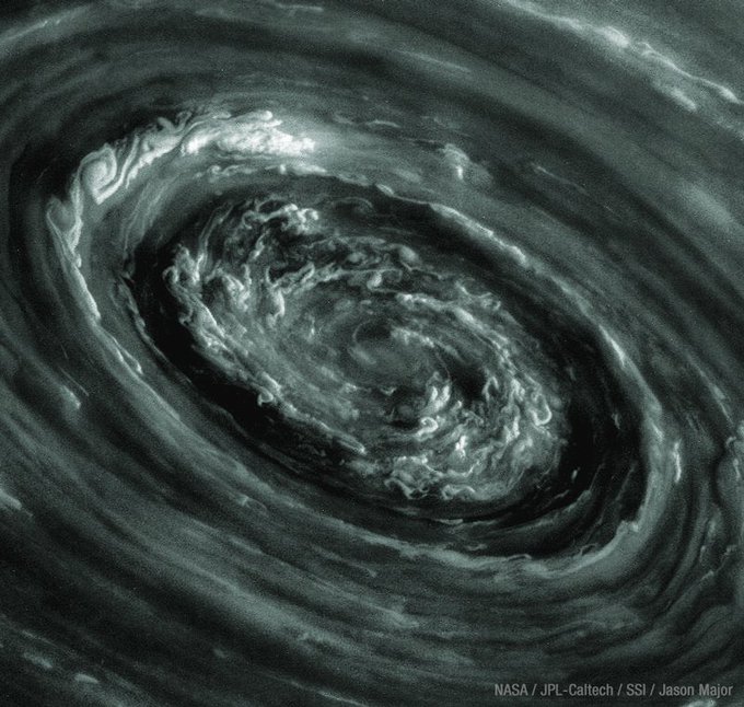 This is a view of a 2000km-wide vortex of swirling clouds around Saturn's north pole, imaged in polarized light with @CassiniSaturn on November 27, 2012 #OTD It’s adjusted to approximate visible-light color of the area. Credit: NASA/JPL-Caltech/SSI/Cassini Imaging Team/JPMajor