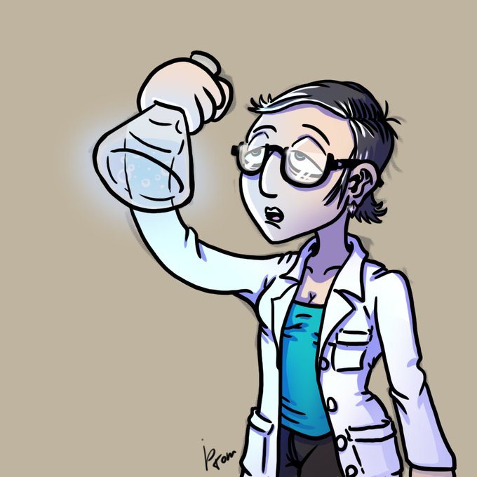 "Une jeune laborantine cheveux bruns courts inspecte un flacon de liquide bleu luminescent". #spitpaint