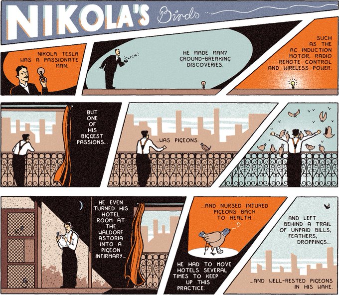 New work in by @rfressonOK check out her new #comicstrip for #historytoday on the story of Tesla inventor of induction motors, radio remote control and wireless power but his greatest passion... pigeons! https://t.co/qi5oXPMiA4