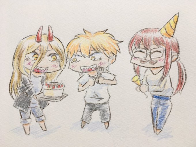 深夜のチェンソーマンらくがき。 仲良くケーキを食べるデンジ、パワーちゃん、マキマさんの図です。 #チェンソーマン #チェンソーマンファンアート