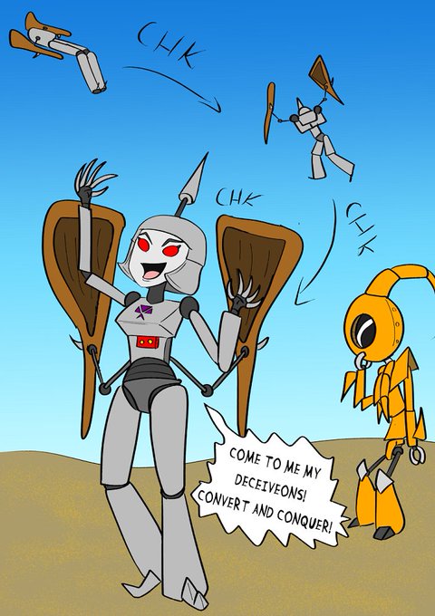 OC of the day: Decitron, the despotic leader of the Deceiveon. A Converter that transforms into a Double Barreled shotgun. She's devious, sarcastic, and more than a bit dramatic. She tends to swing between queen of evil with all the villainous flare in tow, and deadpan snarker.