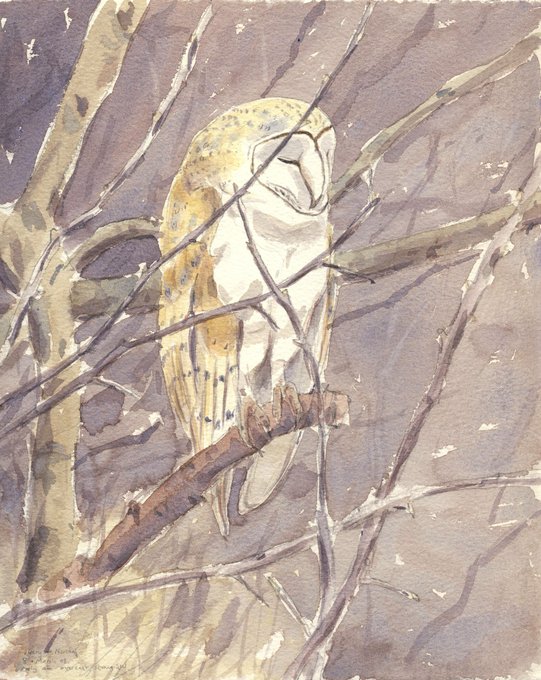 Long-eared Owl fledgling. In May squeaky begging calls of young could be heard around dusk. The young favoured roosting in pines near a track and could be painted with the aid of a scope.