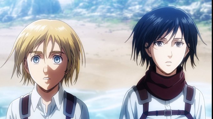 #armin look happy and they finally saw sea the oceans wow I'm so happy for them and especially for arimin but Eren look so tense I don't why he said to kill all Of them outside walls because they're enemies why issayma please give them happy ending