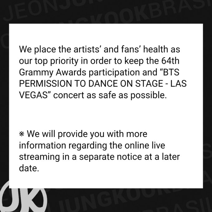 [INFO] 22.02.22 | Em anúncio via WEVERSE, a BigHit confirma a presença do @BTS_twt na 64ª cerimônia do GRAMMYs em 3 de abril, além de 4 shows em Las Vegas, Estados Unidos, nos dias 8, 9, 15 e 16 de abril (com transmissão online) no Allegiant Stadium✨