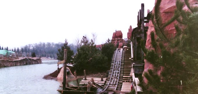 This image of Thunder Mountain captures the built rock cover to the right that houses lighting for the mountain the the splash down effect. Great pains were taken to hide, cover or make ‘go away’ lights and such that are required but not desired. #Disneylandparis