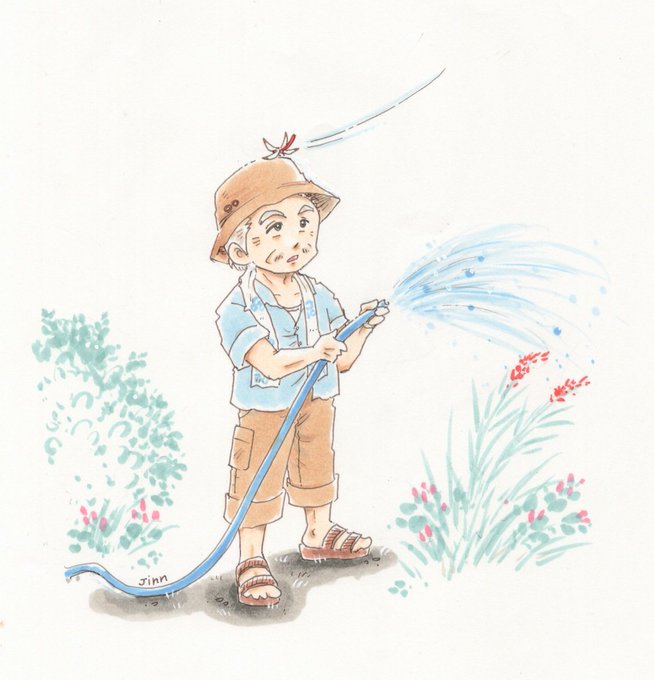 庭で水撒き中のおじいちゃん。