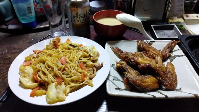 自宅着 今日は焼きそば、手羽先、たまごス-プ ノンアルDRY みなさんお疲れ様でした。