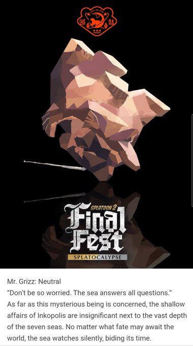 So speculating on Splatoon 3. I have always thought it would be around Mr. Grizz/Salmonid. Some said Chaos=DJ Order=Phone, but I always thought it was weird that Grizz was neutral. Especially when the SOS happened. So my theory was that Chaos or Order, we would still get salmon.