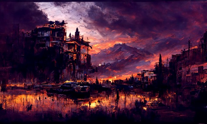 #DyingLight2 #sunset #goodnightgoodluck “a beautiful painting of Dying Light 2 by Ron Walotsky, Trending on ArtStation” #HorrorArt #darkart #cityart @Somnai_dreams @images_ai