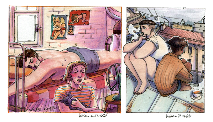 Topical to the heatwave that's currently on us here in good ol' switzerland, have some modern AU sweaty boys trying to survive being cooked alive in their shitty little apartment (+ some real big bro times, when things are bad)