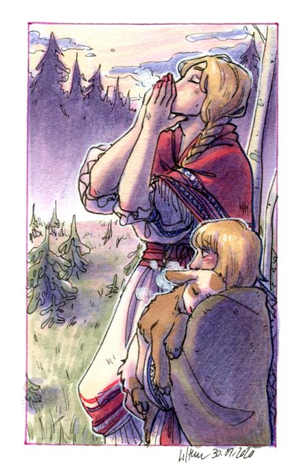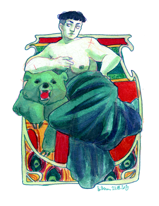 Some Ecoline liquid watercolor doodles I did back in August ! It was fun just drawing whatever and experimenting with color mixing and limited palettes (the first one is based on a Mucha illustration, because when I saw the bear I knew I had to draw Semyon like this)