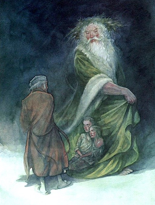 Mr Scrooge and the Ghost of Christmas Present from A Christmas Carol by Mr C. Dickens. Illustrations by P J Lynch