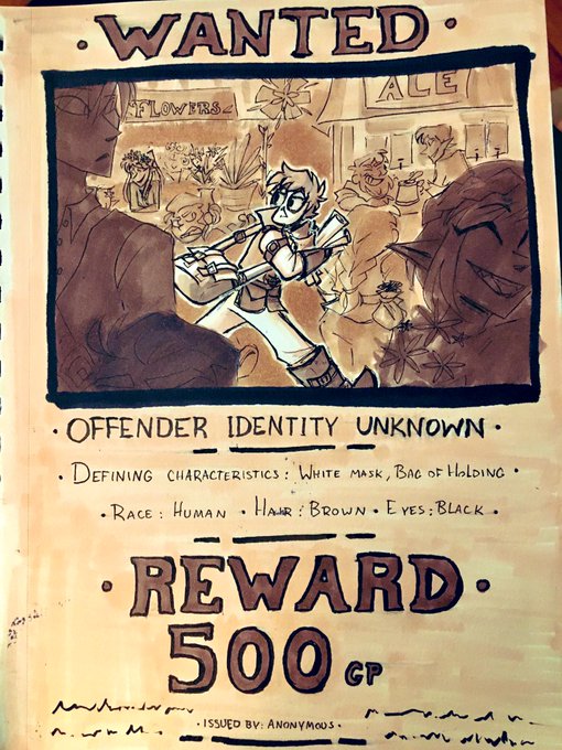 So in GL, some guy made a DOUBLE of the Scientist, and apparently that double is now running around causing trouble. So I drew up the wanted poster we found hanging outside the tavern! And yes, he did somehow manage to survive after yeeting himself off the 100ft balcony.