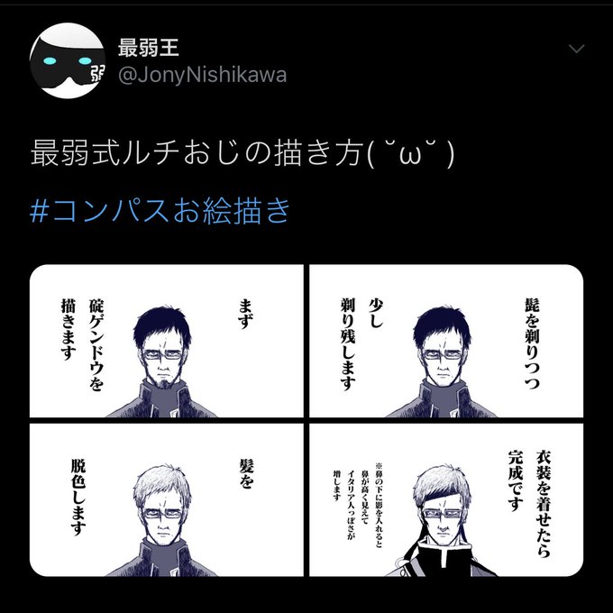 ちなみに最弱王にもいくつか模倣品があります( ˘ω˘ ) コンパス関係で自分描く時(1枚目)はいつも茶葉式ボイド(アイコン)の模写ですし、自己防衛メグメグ(2枚目)は自己防衛おじさん(3枚目)のトレスだし、ずびりこ(4枚目)に至っては描いた後に既視感(引用元)に気付く始末。 https://t.co/yXmTRDLZ0M https://t.co/3Td4qCHqaA