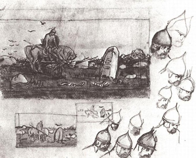 @cinthya_cosas Hizo muchos bocetos en los que se puede ver como cambió al final el enfoque para darle más dramatismo... el pobre ahí de bajón mirando a los esqueletos como si fuesen una premonición de su futuro y el de su caballo... 😔 https://t.co/8O0sZQhVbz
