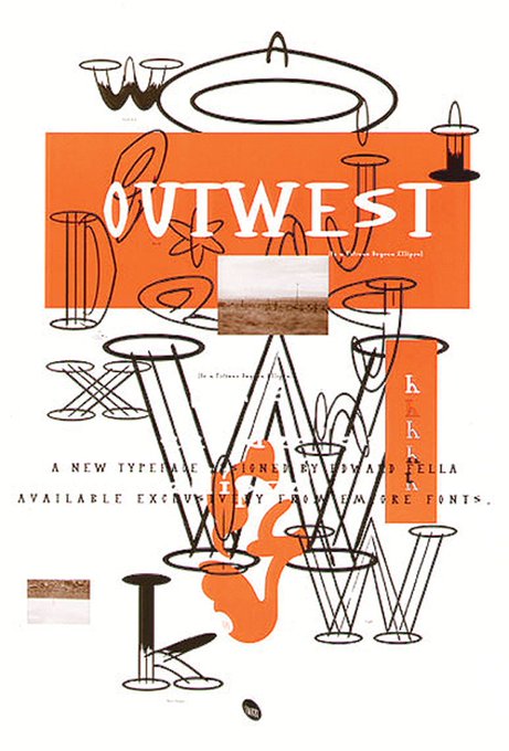 Examples of Ed Fella’s later signature style, including the typeface Outwest created in 1993. Fella was awarded the 2007 AIGA Medal: “By battering and mixing fonts, engaging in visual puns and generally violating the tenets of good design, Fella lets a thousand flowers bloom.”