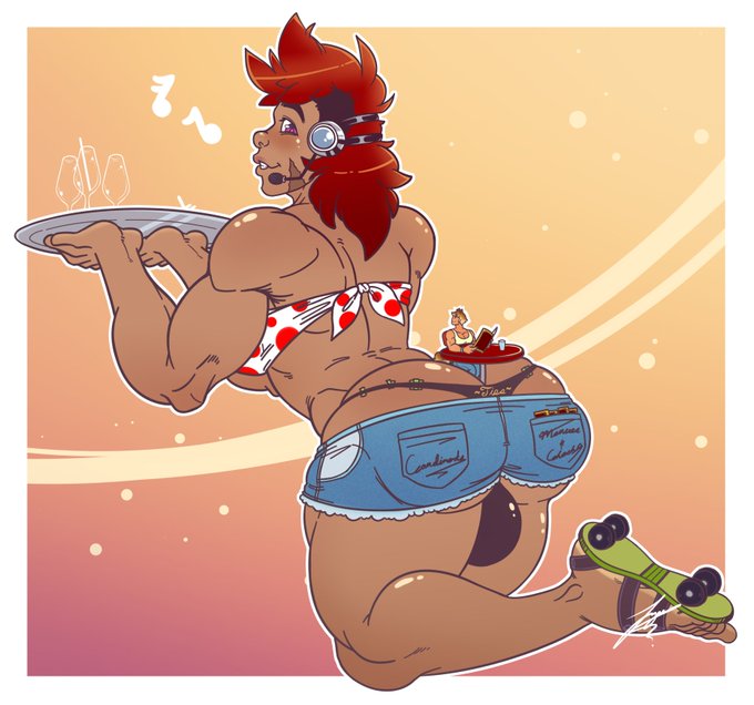 Patron requests from @Einherger Of his OCs doing #giant shenanigans. Left is his OC Sun hosting at a maco Hooters with special seating hehe. And right is his giant pup Rex being used as a diving board for Sun hehe.