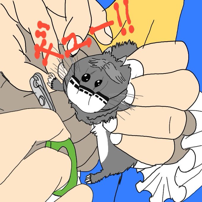 くっそ雑に描いたトレス イソハム⚰️🐹ハムスターは怒ってる時 「ギュー」「ギッ」「ジージー」って鳴くんだって! これはおジョゼが飼っているイソハムを病院に連れて行って、爪を切ってもらう図。 (元ネタ右→)