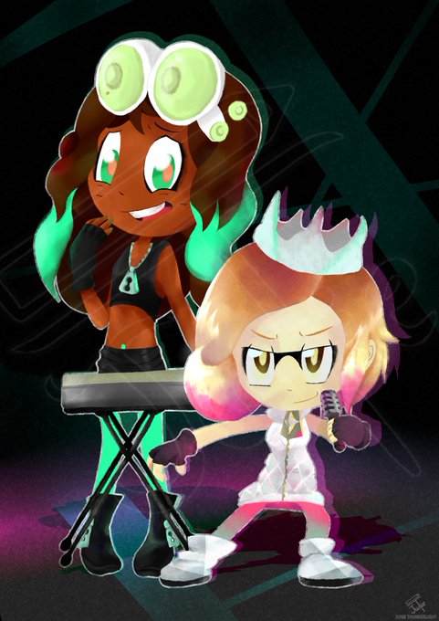 Are these Marina and Pearl from Splatoon 2? Actually, they are Mirta (left) and Eria (Right), my own characters, cosplaying as them. I love how the costumes fit their personalities