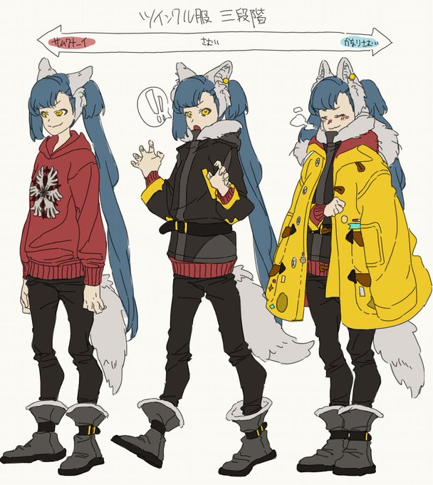 ツインクル服三段階。 髪の色は黒~青っぽい感じで適当に あと長さもけっこうてきとう。 左のパーカーは作ろうとしてるやつ(放置)で、なかなかその絵が完成しないのでちょうどいいしツインクルに着せたという小話。 #横町ファンタジア