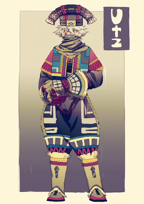ウツ お題:ファンタジー、男、18歳、格闘家、恥ずかしがりや 部族の青年たちの中で最も強い者がこの装束で戦い、村を守る。手袋の指先の部分には毒が塗られており拳を握ると染み出す仕組み。 #キャラデザ勉強会よん 三日の遅刻!!!