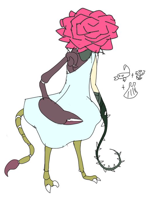 #リプ来た3つの絵文字でキャラデザする 数分クオリティですまぬ。 🦈🦖☠️ 🌹🦂👗 🦖🔪🔫