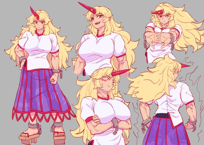 新刊に出したいキャラたちの設定画描いてくよ 旧地獄組、勇儀さん描くの楽しすぎたぞ #霊烏路空 #星熊勇儀