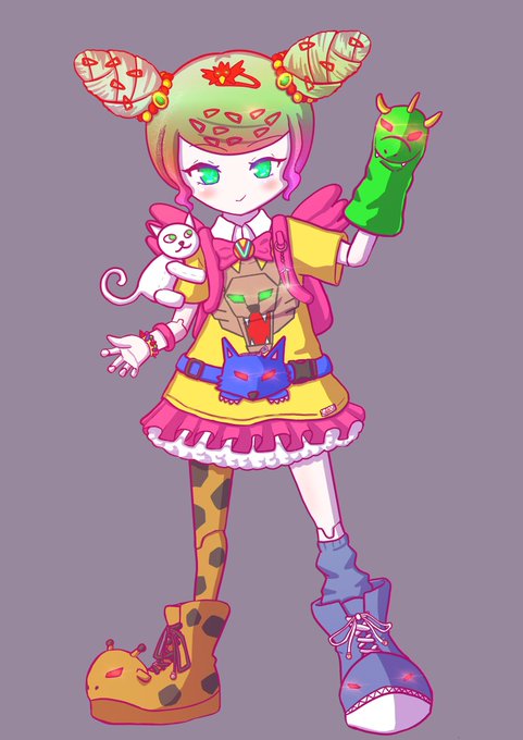 グレートビーストカイザーV モチーフは"スーパーロボット" 動物メカが合体するロボットって顔が沢山あってがちゃがちゃしててKAWAIIの文脈と相性良いのでは!?という気持ちを検証したくて生まれました。 先にロボのラフデザインを描いてから各メカを相同するファッションアイテムに変換しました。