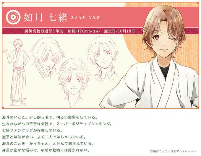 中学最後の試合以来、自信を失っていたが、再び弓道とそして自分自身と向き合うことを決意してからは本来のアクティブな性格に戻り、自分のことを嫌っている海斗にぶつかっていく一直線さを持つようになった。意外と野生児。