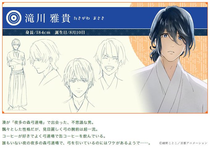 湊が「夜多の森弓道場」で出会った、不思議な男。飄々としているが、見目麗しく弓の腕前は超一流。コーヒーが好きで、よく缶コーヒーを飲んでいる。夜、誰もいない森弓道場で、弓を引いているのにはワケがあるようで……。