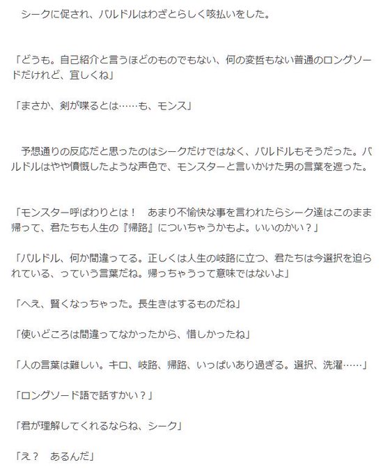 そして、バルドルが我慢できずに……? 真夜中のシークと武器達の、緊張感のない会話をお楽しみ下さい!
